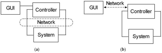 From the point of view of control and supervisory systems, the utilization of communication networks can be considered in two aspects. Firstly, we consider a scenario in which the control loop is closed through the network. In such a case, the resulting approach belongs to the field of Networked Control Systems (NCS). In general, NCS are comprised of the system to be controlled and of actuators, sensors, and controllers whose operation is coordinated through some form of communication network []. On the other hand, the communication network can be integrated in the supervisory system to access the controller remotely. The purpose of this application is to perform the online parameterization of the controller and the monitoring of the process variables via a graphical user interface (GUI). Furthermore, the last application provides the possibility to access resources or facilities by remote users. Figure 1 shows the differences between these approaches. Figure 1a depicts the NCS scheme; as can be observed, the controller and the system interact through the network. In Figure 1b, the network serves to access the controller without intervention in the control loop.