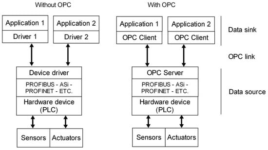 However, it is possible to make different PLCs “talk” to one another or even to other hardware devices using a common language. The Object-Linking and Embedding for Process Control (OPC) assumes this role. The OPC protocol comprises seven specifications established by the OPC Foundation []. Based on client/server architecture, its goal is to provide open connectivity and reliable communication in automation. The intervention of specific drivers for each field device is eliminated by using the OPC standard. This way, hardware and software manufacturers provide a sole driver to connect the device to the OPC server and external applications are able to communicate with such a server without knowledge of the physical device. Figure 3 reflects the advantages of using the OPC protocol to exchange data. The hardware device acts as a data source through the OPC server, and the software applications play the role of data sinks (OPC clients) whereas the OPC link serves as a vehicle for data flow.