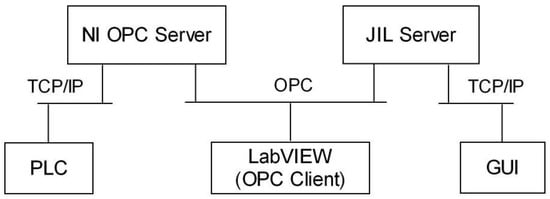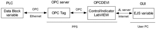 The data communication network acts as the backbone of the designed system. Data exchange between the PLC memory and RL interface has been developed using the structure of communications depicted in Figure 6. The signals involved in the control and monitoring of the DCSM are acquired and managed by the PLC. These ones are accessed by an OPC server so they are available for OPC clients. Such a role is played by a VI specifically created for exchanging data with the OPC server (OPCDEVI). The next stage consists of the JIL server, which establishes the connection between EJS and LabVIEW VI. This way, information flows between OPCDEVI and GUI, where the user interacts in real time with the remote experiment. Hereafter the involved parts are described sequentially, starting with the OPC server.