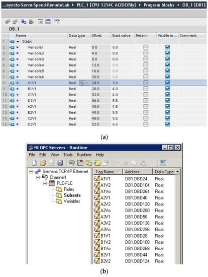 To do this, among other parameters to be specified, the most significant ones are the IP address and the device model, the used addresses in the PLC memory, the format of the data and the type of access. For the current sample application, three groups of tags have been created, one for I/O variables, another for the fuzzy subsets and the last one for the rules of the FLC. For instance, for the fuzzy subsets, the first tag corresponds to the point called A1V1. It is located inside a data block (DB1 of the PLC) in position number 24 with a float format, so its address is DB1.DBD24, as is shown in Figure 7a. On the other side, Figure 7b shows the OPC tags created for accessing these points.