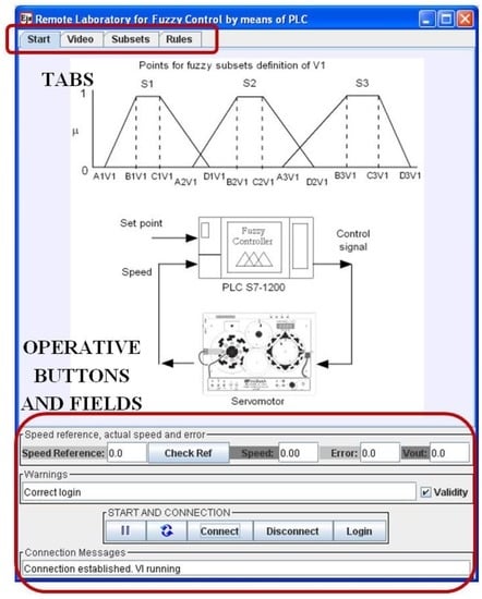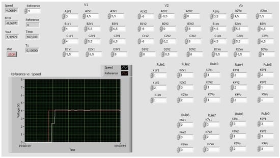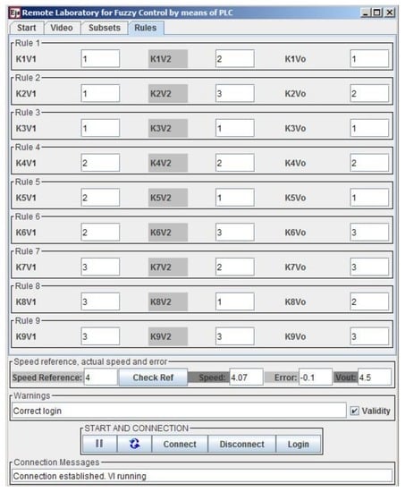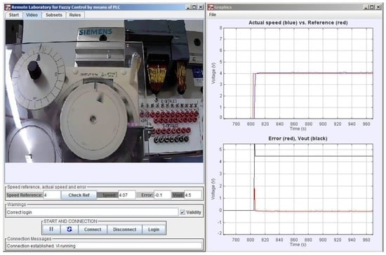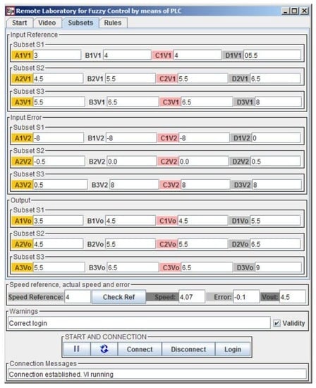 The proper use of the RL relies on the interaction of the user with the PLC memory positions to parameterize the controller and experiment. To this aim, the GUI contains a set of input fields that allow entering the desired values for the FLC parameters. The reference value for the speed of the DCSM is also written this way. Output fields are used to show the values related with sensors’ measurements and variables such as the actual speed, error and control signal. In addition, these values are represented over time to provide visual feedback information useful to the user. Therefore, the PLC memory has to be addressable and accessible for actions demanded by the GUI. The designed scheme satisfies this requirement.