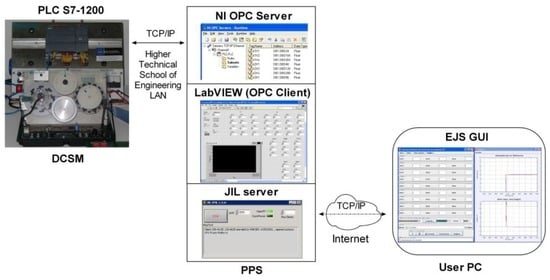 PLCs have been previously validated as a useful resource for automation and control-devoted RLs. Besada-Portas et al. [] implement a RL with an EJS interface and a TwinCAT PLC applying different controllers to a DCSM. In that case, the linkage between the PLC and the EJS was performed with a Java server application. Another example can be found in [,], where the GUI is implemented with JavaScript and XML. As stated by the authors, the use of PLC provides flexible connectivity at the back-end, allowing, through, it any kind of industrial plant device to be used in RLs.