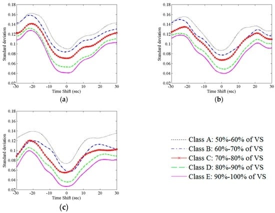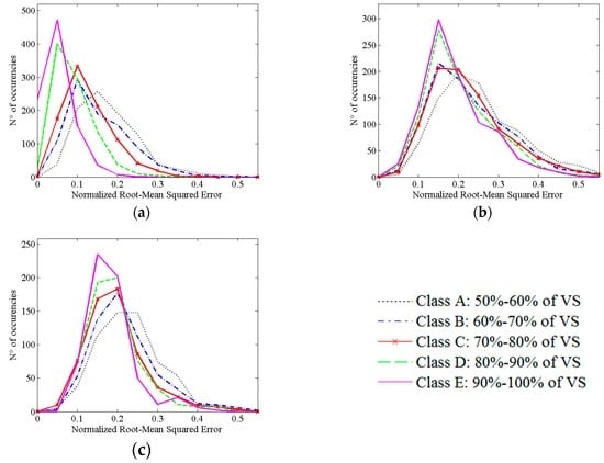 - Each subject i is assigned to a class according to the percentage of VS with respect to the overall signal length. Five classes are considered, as described in Section 2.4 (class A: 50%–60% of VS, class B: 60%–70% of VS, class C: 70%–80% of VS, class D: 80%–90% of VS, class E: 90%–100% of VS);