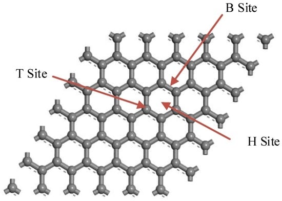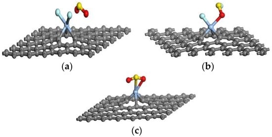 Table 1 shows details of the binding energy in three possible positions, demonstrating that T-site holds the minimum energy. Moreover, the T-site model could be speculated to be the main decorated structure during experimental preparation according to the single metal atom decorated in the same method []. Therefore, we regarded the T-site model as the gas-sensing material to study its gas sensing properties to SF6 decomposition products, which was verified and used in previous similar studies [].