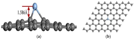 Figure 3a and Figure 4b respectively offer the side and top views of the T-site model after geometry optimization, which illustrates that the Ag atom embedded on the graphene does not lead to the change of the whole two-dimensional plane structure of graphene, but rather protrudes out of the C atomic layer plane with distance (1.586 Å) along the Z-direction and forms covalent bonds with its adjacent C atoms with 2.053 Å bond length. This further supports the idea that an Ag-decorated graphene structure has a local sp3 configuration. Otherwise, the similar decorated structures of local sp3 configuration were also found in other metal-element-decorated graphene (Pd, Pt, Mn, etc.), and it is generally believed that local sp3 configuration is correct in metal-doped graphene theory research [].