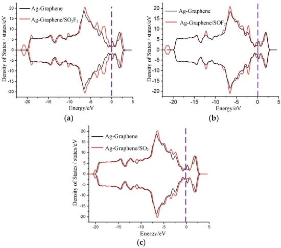 DOS for Ag-graphene with and without single-molecule adsorption in (a) SO2F2; (b) SOF2; and (c) SO2.
