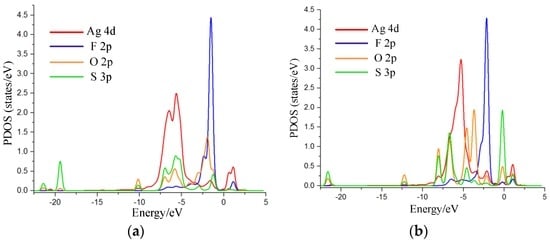 DOS change was evident before and after SO2F2 adsorption by comparison, as shown in Figure 6a, where DOS decreased near the 0.8 eV conduction band and then increased in valence band range from −3 eV to −6 eV, which mainly led to an increase in the conductance of Ag-graphene/SO2F2 system. Figure 7a shows that PDOS peak near the −6 eV valence band causes DOS increase; because the 4d orbital of Ag atom hybridized with the 3p orbital of S atom and 2p orbital of O atom of SO2F2 in a certain filling rate degree, which bring a strong interaction between SO2F2 and decorated Ag.