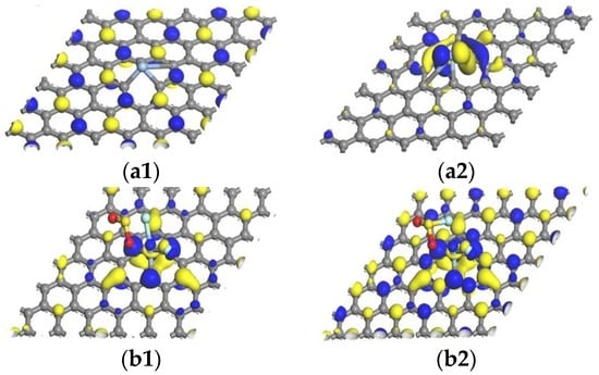 Before absorbing gas molecules, the HOMO and LUMO of Ag-graphene were mainly distributed at the Ag-decorated site and its opposite site in Figure 8a1,a2, and the energy gap of Ag-graphene was 0.272 eV (see Table 4). The energy decline of HOMO and LUMO was due to the adsorption process, but its HOMO–LUMO energy gap increased in the system. When SO2F2 was adsorbed on Ag-graphene, the energy gap of Ag-graphene/SO2F2 increased to 0.761 eV, which indicated that the SO2F2 adsorption greatly increased system conductivity. After SO2 was adsorbed, the energy gap of the system slightly increased to 0.359 eV, which supported that conductivity of the Ag-graphene/SO2 increased to a certain extent. However, SOF2 adsorption almost had no effect on changing the energy gap of the system. All cases were consistent with the conclusion obtained through DOS analysis above.