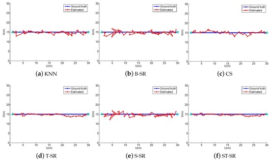 The localization results (red) of the line path (blue) in the simulated scene. B-SR, Basic Sparse Representation; CS, Compressed Sensing; ST-SR, Spatio-Temporal Sparse Representation.