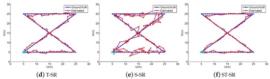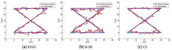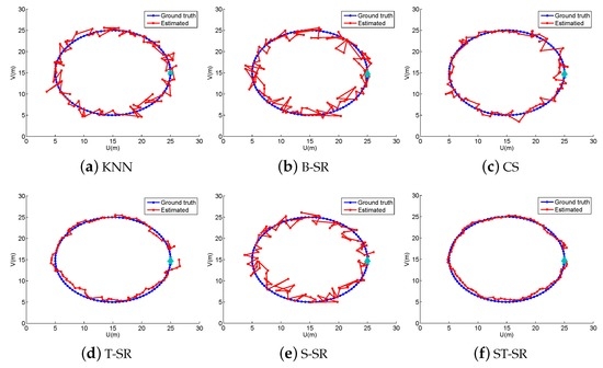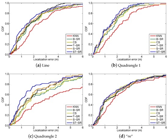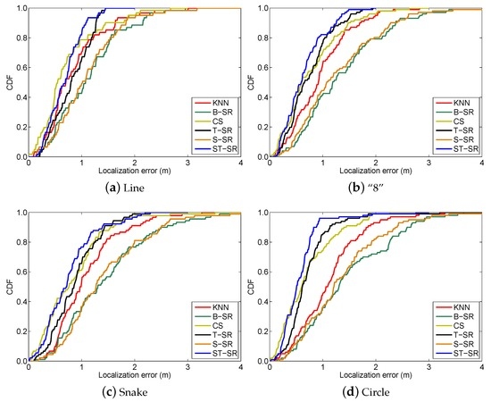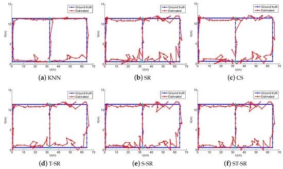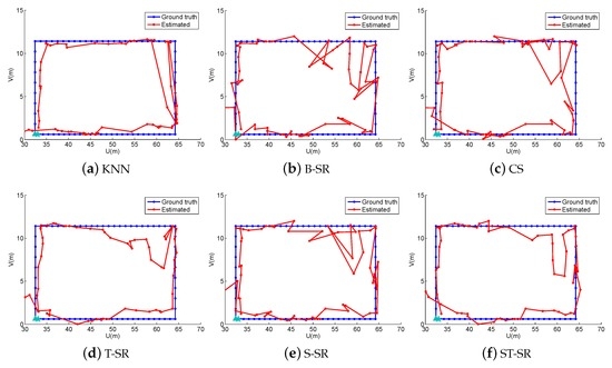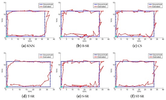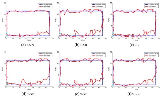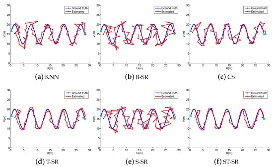 To obtain reliable results, each experiment has been repeated 20 times, and the average result is recorded as the final result. The parameters of the proposed ST-SR, S-SR and T-SR methods are empirically set as , , . Figure 1, Figure 2, Figure 3 and Figure 4 show the estimated paths (the red line) compared with the ground truth (the blue line) with different localization methods. Intuitively, the proposed ST-SR method has the best localization performance, as it has a close and smooth estimated path compared with the ground truth. The localization errors of different methods are reported in Table 1. Meanwhile, we show the empirical Cumulative Distribution Function (CDF) curves of the localization error for all of the methods in Figure 5. It is shown that the proposed ST-SR method obtains the best location results (in bold text) and shows more robustness than the other methods.