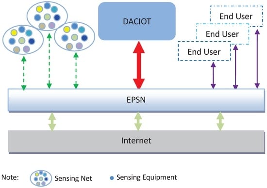 As shown in Figure 1, DACIOT’s key role is to provide network access services for end users (including PCs, mobiles, etc.) and coordinate the massive amount of end users’ requests via transmitting them onto a sensing device. In relation to control demand transmission, as the Internet network has the features of complex structural alternation and fast resource consumption when a massive number of users requests arrive for access, an Effective Path Statistic Network (EPSN) [] is built and arranged on the Internet, based on the idea of network coverage. EPSN, a logic network comprised of a group of Communication Service Agents (CSA) which has a number of simple functions (data packet sending, receiving, storing and exchange), is a virtual sub-network of the Internet. EPSN explores the effective “empty” path on the Internet based on statistical theory, and measures and calculates the statistics of the measurement parameters and information on the logic chain among CSAs, and builds real-time Effective Paths (EP) based on the measured and statistical data. In this sense, the network that receives the requests for access by the end users is converted from a parameter-uncontrollable Internet network to a transparent and controllable EPSN network. However, the new-type DACIOT is mainly supported by virtual technology [,], which is critical to realize cloud computing networks by intensively concentrating and integrating the limited physical resources and providing services of networking, computing and storage in a unified manner. The virtual resources of computing and storing will finally need to provide access to users via the network. In the realm of network, virtualization technology enables a higher utility of the network [] and makes the network flexibly extendable and manageable. A virtual network allows users of different needs to visit the same physical network. Logically, however, these users are strictly isolated to ensure visiting security []. Network virtualization will fulfill the target of improving DACIOT’s [] operational efficiency, flexibilizing operation arrangement, reducing energy-consumption and releasing rack space.