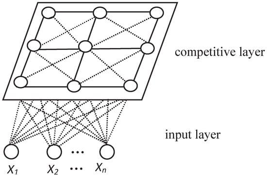A Self-Organizing Feature Map (SOFM) neural network, first initiated by Finnish scholar Kohonen, has been widely applied in a number of information processing fields [] for its features, including topology structure maintenance, mass parallel processing, distributed information storage, good self-organizing and learning capacity, distributed adaptive output consistency [], non-supervision of clustering and visualization, etc. SOFM is comprised of an input layer and output layer (the output layer is also called the competitive layer). The neurons of the input layer are fully linked to the competitive layer and each neuron represents one category. In accordance with the rules of learning, the repeated learning will be able to capture the feature of each of the input models, which will undergo self-organizing clustering and form a clustering result at the competitive layer. The topological graph is shown in Figure 3.