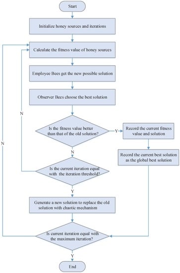 - To assume that the solution for the current search stagnancy is , which is mapped into the domain of definition of the chaos system mentioned above as in the following equation:An iteration based on Equation (13) results chaos variable sequence (), in which refers to the maximum number of iteration for bee colony local search.