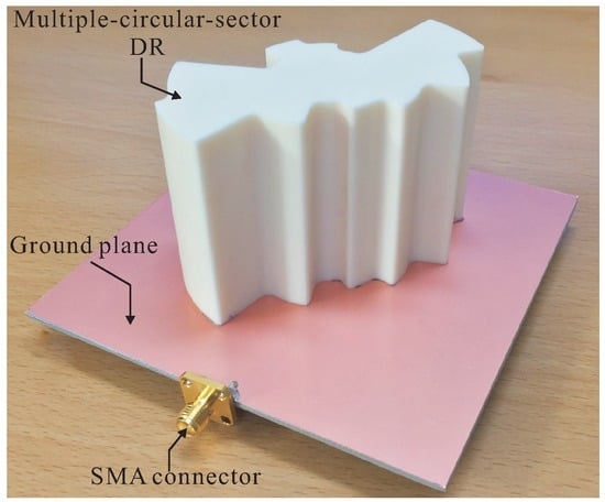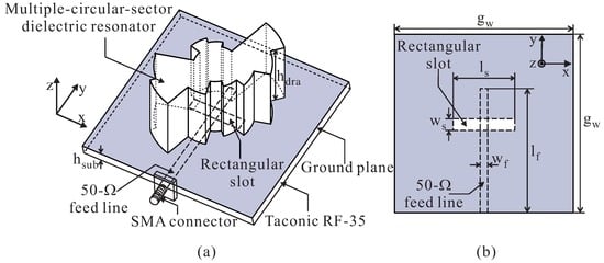 With the rapid development of wireless communication systems, the demand for high efficiency, wideband, and compact antennas has increased significantly [1,2]. Various types of antennas, such as microstrip patch antennas [3,4] and dielectric resonator antennas (DRAs) [5,6], have been investigated and developed for wireless communications. However, microstrip patch antennas (known as metallic-based antennas) usually have low radiation efficiency levels, owing to conductor loss. Meanwhile, DRAs, with no conductor loss, offer the advantages of high radiation efficiency, ease of excitation, small size, and wide bandwidth [7,8]. Therefore, DRAs have become an excellent candidate for use in wireless communication applications.