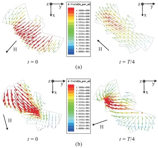 In order to verify the generation of LHCP, the H-field distribution on the top surface of the proposed multiple-circular-sector DR is investigated. Figure 3a presents the simulated H-field distribution observed in the positive z-direction at a frequency of 2.3 GHz. When t = 0, the vector of the major H-field distributions points from the upper right corner to the lower left corner. In contrast, the vector of the major H-field distributions at t = T/4 points from the lower right corner to the upper left corner. This vector is orthogonal to that at t = 0, and rotates clockwise as the time t elapses, thereby generating LHCP in the positive z-direction. The H-field distribution observed in the positive z-direction at 2.5 GHz is illustrated in Figure 3b. Similar to the case at 2.3 GHz, the vector of the major H-field distributions at t = 0 is orthogonal to that at t = T/4, and rotates clockwise as the time t increases. Therefore, LHCP is also produced in the positive z-direction.