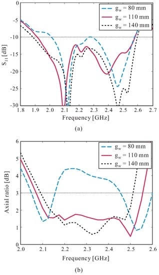 The effects of the ground plane size on the reflection coefficient and AR performance are also investigated. The simulated results are illustrated in Figure 4, in which the AR values are observed in the broadside direction (θ = 0). As shown in the figure, dual-band CP operation is achieved with = 80 mm. When increases, two CP bands are merged to form a wide 3 dB AR bandwidth. In addition, the reflection coefficient in the middle frequency range is improved, while the overall −10 dB reflection bandwidth is only slightly affected when increasing the value of . However, the overall 3 dB AR bandwidth of the proposed antenna is reduced when is increased further. The value of is finally set to 110 mm, as this value provides the widest 3 dB AR bandwidth.