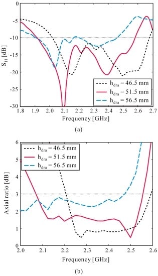 The effects of the DR height on the reflection coefficient and AR performance were studied, and the simulated results are illustrated in Figure 5. It was found that the operating frequency band moves to a lower frequency region, and that the AR levels are increased close to 3 dB when is increased. When equals 56.5 mm, the reflection coefficient levels around 2.18 GHz are increased to more than −10 dB, resulting in two separate −10 dB reflection bandwidths (see Figure 5a). Meanwhile, as shown in Figure 5b, the 3 dB AR bandwidth becomes narrower when is reduced to less than 46.5 mm. Finally, the optimal value of was found to be 51.5 mm.