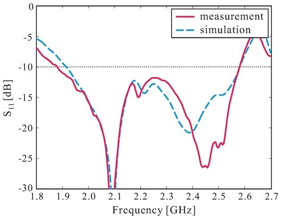 Based on the optimized design parameters listed in Table 1, a prototype of the proposed antenna was fabricated. A 99.5% alumina ceramic material with a dielectric constant of 9.8 and a loss tangent of 0.0001 was utilized to fabricate the proposed DR. Figure 7 shows a photograph of the fabricated antenna. Epoxy adhesive was used to glue the bottom layer of the multiple-circular-sector DR to the ground plane. An Agilent 8510C network analyzer was used to measure the reflection coefficient of the fabricated antenna. The measured and simulated results of the reflection coefficients are illustrated in Figure 8. Good agreement between the measurement and simulation results was achieved. It was found that the measured and simulated −10 dB reflection bandwidths were 31.39% (1.88–2.58 GHz) and 29.33% (1.91–2.58 GHz), respectively.