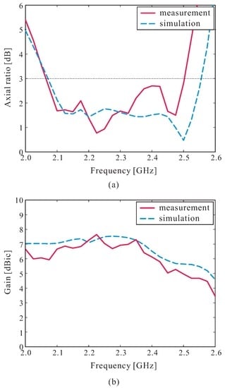 For the measurement of the radiation characteristics of the proposed antenna, a dual-polarized rectangular horn antenna in a RF anechoic chamber was utilized. The measured and simulated results of the ARs and LHCP gains of the proposed antenna in the broadside direction (θ = 0) are shown in Figure 9. As can be observed in Figure 9a, the measured and simulated 3 dB AR bandwidths were 19.30% (2.06–2.50 GHz) and 21.17% (2.07–2.56 GHz), respectively. Within the measured 3 dB AR bandwidth, a measured peak LHCP gain of 7.65 dBic at 2.225 GHz and gain variation of less than 2.70 dBic were achieved, as shown in Figure 9b. Reasonable agreement was noted between the measured and simulated results, with some discrepancies mainly attributed to experimental tolerances, fabrication imperfections, and the existence of a slight air gap between the DR layer and the ground plane during the gluing process, as discussed in Figure 6.