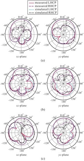 Figure 10 plots the measured and simulated radiation patterns of the proposed antenna on the xz-plane (ϕ = 0) and yz-plane (ϕ = 90) at the three frequencies of 2.1 GHz, 2.3 GHz, and 2.5 GHz. It is evident that the proposed antenna is an LHCP antenna, and that the radiation patterns are directional toward the broadside direction. In addition, on both planes, the LHCP gains are 20.30 dB, 20.38 dB, and 14.50 dB higher than the right-handed circular polarization (RHCP) gains in the broadside direction at these three corresponding frequencies. The deterioration of the radiation patterns is due to the asymmetry of the proposed DR configuration along the x-axis and y-axis. This effect becomes stronger at higher frequencies.