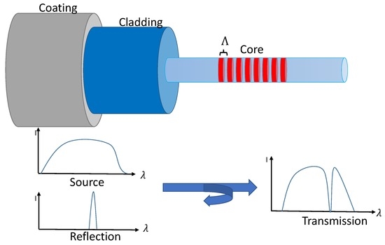FBGs are a type of spectral coded sensor, as their evaluation can be performed via intensity analysis, as well as resonance wavelength analysis. This resonance wavelength is called Bragg wavelength and is sensitive to changes in temperature and elongation . In Figure 1, the structure of an optical fibre with an FBG is illustrated. The core of the fibre contains a periodic modulation of the refractive index [21]. If a broadband light source is used as the input, part of the light will be reflected, and the rest is transmitted. If there is an elongation of the part that contains the index modulation, e.g., caused by a strain ϵ, the grating period Λ undergoes a linear geometric change that results in a shift of the reflection. In addition, the refractive index changes, which can be described by the opto-mechanic effect. This effect enables the measurement of the applied longitudinal strain ϵ.