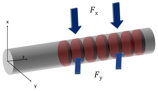 FBGs are sensitive to temperature and strain, so that a compensation method is needed if just one of these parameters is required. For an embedded FBG, the internal strain matters, and therefore, a method to measure the temperature has to be found. For example, a second test point can be equipped with a thermocouple, and its data are used to calculate the influence of the temperature. It is important that the reference point be as near as possible to the original test point or be placed in a reference probe under the same conditions. After this is done, the recorded strain can be determined. Another characteristic has to be explained when embedding FBGs into materials: amorphous solid materials, such as glass or plastics, are generally isotropic. Hence, only one refractive index appears in an optical fibre. In Figure 3, two different transversal strains and are present. For an FBG in a single-mode fibre, these varying strains induce two local dependent refractive indexes [31,32]. This leads to a separation of the reflection from one into two peaks and is called birefringence [33,34].