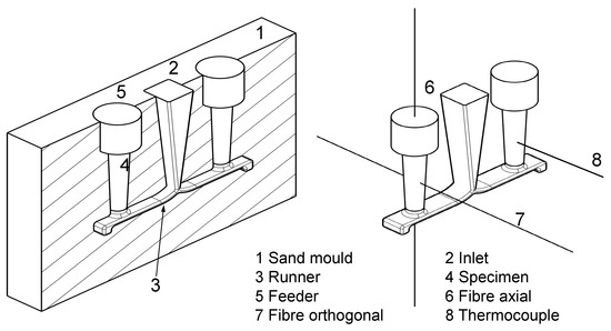 For casting processes, a mould that keeps the liquid alloy in place is needed. For the experiments, a hand-formed sand mould was used, as shown in Figure 4. Two mould halves form the cavity, which consists of a runner and a feeding system for casting aluminium specimens. The mould allows one to place the fibre in axial and orthogonal direction and, thus, measure in two independent directions. For each measurement, only one FBG was used to avoid the disturbance impact on the probe being too large. Another reason for the solution with one sensor was to avoid any mutual interactions during the solidification process. The fibres were fixed in the mould with the help of stainless steel capillaries. The outside diameters of the capillaries were 0.8 mm. In each case, two of them were used, and the FBG was located between these elements. As the difference between the ends of the capillaries and the FBG is more than 15 times the capillary diameter, there is no influence of the capillaries on the measurement [37]. There are several advantages of this fixing method. Firstly, the capillaries are robust and can be plugged into the hardened sand without destroying either the form or the capillaries. Secondly, they enable the fibres to be fixed without the risk of breaking them. Thirdly, they protect the fibre during the casting process. With every mould, there are two specimens, as can be seen in Figure 4. With the aid of the second symmetrical specimen, a reference measurement of the temperature can be conducted. The symmetrical form allows us to assume that heat distribution behaviour will be uniform. The reference measurements were performed with a k-type thermocouple. The form filling process lasted about two seconds at 740 C. The composition of the standardized aluminium alloy is given in Table 2 (DIN EN 1706:2010).