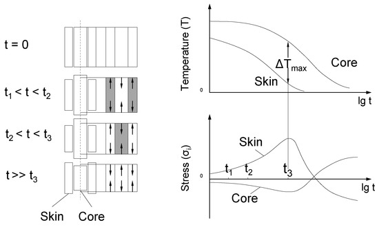 It is restricted to the borders if the height of the cylindrical body is larger than its diameter (), because the disability of the flow in the core will occur due to the multi-axis system. After reaching the maximum temperature difference at time , the plastic deformation stops for the moment. The beginning heat adjustment minimizes tensions at the border and compressions in the core areas until conversion of the mechanical tensions starts. This does not appear simultaneously in the whole cross-section. After this conversion, especially the core shrinks. Thus, there are simultaneous compressive stresses at the border and tensile stresses near the core after a balance of the temperature is achieved. This behaviour is typical for thermal residual stresses.