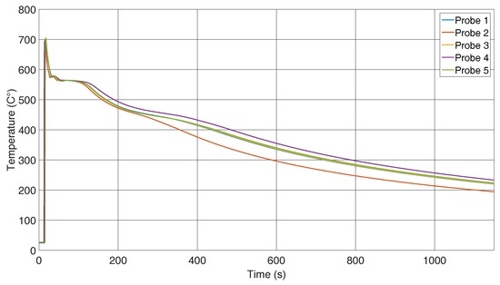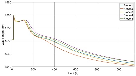In this section, the results of the position-dependent measurements are shown. Figure 7, Figure 8 and Figure 9 refer to experiments where the FBG was located across the material flow direction, as shown in Figure 6. Five castings were executed with this FBG position, and all of the FBGs used had the same specifications. A measuring time of 1150 s was chosen because the temperature in the reference path reaches 200 C within this span. At this point, it is certain that the solidification process will have finished. Initially, the reflected spectra show the same peak, which changes noticeably after 120 s, where we have a clear differentiation, that can be seen in Figure 7, which shows the wavelength shift caused by the strain and temperature changes.