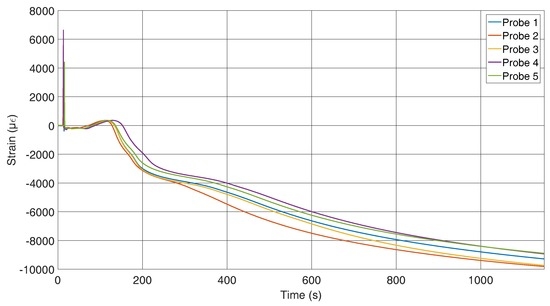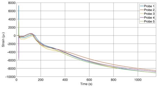 The curve with 1 in Figure 8 corresponds to the 1 in Figure 7. The comparison of all curves indicates that the mismatch between peak wavelengths is caused by the various cooling rates of the probes. As explained before, if the temperature is known, the applied strain on the sensor can be calculated. In Figure 9, peak shift and temperature were used to calculate the strain. The measured strain represents an average over the grating length, but due to the small grating length, its behaviour can be considered as a point measurement.
