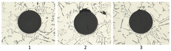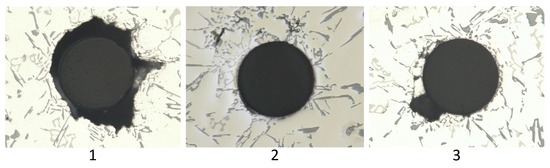 Figure 13 shows three cross-sections of probes with fibres along the flow direction. Figure 14 illustrates the cross-sections of across-fixed fibres. The black areas around the fibres, especially in the first panel of Figure 13, present imperfections, such as gas bubbles or vacuum cavities. In addition, these imperfections cause the formation of an oxide layer around the fibre, which cannot be seen in the three parts of Figure 13 because of its small dimensions. This additional layer has its own transfer function, and thus, the strain transfer can differ. Another disruptive factor also has to be analysed because the oxide layer is not homogeneously attached around the fibre, which can initiate birefringence. As the shown cross-sections present only a small part of the probe and the measurement data still indicate strain, it is certain that these imperfections do not cover the whole FBG.