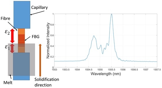 Besides the mentioned tests with a grating length of around three to four mm, additional set-ups with a grating length of 8 mm and a position along the melt flow were done. For the further consideration, it is assumed that the melt solidifies along the fibre. In the left panel of Figure 15, solidification along the fibre is presented in a simplified way. The solidification front arises from the bottom up to the top and, because of the grating length of eight mm, the sensor divides into two different parts. Now, the strains and form the reflected spectrum of the FBG that can be seen in the right part of Figure 15. This multi-strain behaviour can be observed also after the solidification process for 8-mm gratings. To understand the problem, the algorithm to analyse the data has to be taken into account. The reflection is fitted with a Kaiser window followed by a peak-finding, which finds the maximum value. Thereby, only one value is used to calculate the strain. That means only one strain is observed, which does not correspond to the complete strain along the fibre, and besides that, the two strains interact, which creates an extra error.