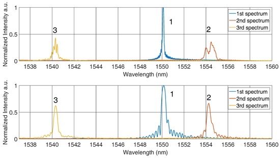 Comparison of the reflected spectra of an 8-mm FBG (upper graph) and a shorter FBG with a length of 3–4 mm.