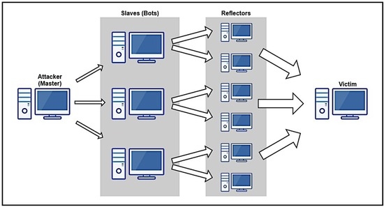 Figure 1 illustrates a typical architecture for an AR-DDoS attack. Basically, it is identical to usual DDoS attack architecture, with reflectors before the victim to amplify traffic. As it shows, there are two layers between attacker and victim: the reflectors, which effectively send amplified traffic directly to the victim; and a set of compromised hosts (slaves or bots) which are controlled by the attacker (master) and send probes to reflectors. Rigorously, this intermediate layer is not necessary, as the attacker can efficiently perform an attack by sending probes directly to reflectors. This intermediate layer performs two functions: it contributes to increase attack scale, and provides attack source obfuscation, further protecting the attacker; besides, it is already present in the typical DDoS architecture.