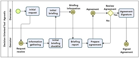 The initial briefing is the moment when demander and executor answer the checklist to generate a report. The last activities in this phase involve preparing and signing an agreement between demander and executor. Although that might be unnecessary when demander and solicitor are the same, in the general case, some legal framework is needed to protect both parts.