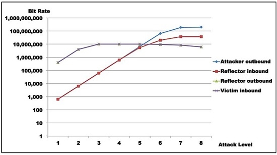 - Victim analysis: The graph also demonstrates that, in both scenarios, the victim receives traffic from reflector at the rate it is sent. For successful DoS, other reflectors would be needed to either bring the victim down or flood its link.