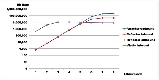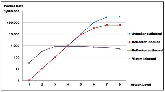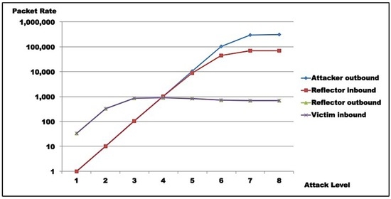 Test results indicate that saturation was achieved at reflector and attacker levels. In both test rounds, Figure 11, Figure 12, Figure 13 and Figure 14 indicate the reasons for saturation. For the attacker, saturation occurs when line speed is achieved. For the reflector, line speed is not achieved, and probe processing for amplification requires more processing than probe generation. So, reflector saturation is due to processing.