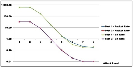 Test 2: Traffic rates by attack level (Bit/s).
