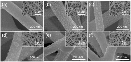 Figure 1 shows the microstructures of the Pt-functionalized SnO2 NFs observed using FE-SEM. Figure 1a shows the typical microstructure of pure SnO2 NFs for comparison. Figure 1b–f show SnO2 NFs onto which various amounts of Pt were deposited (3, 5, 10, 15, and 20 nm, respectively) and subsequently heat-treated. The average diameter of the fibers was ~165 nm. It is obvious from these images that the Pt layers broke into small clusters or islands during the heat treatment process. The thinner layers formed many smaller Pt clusters while the thicker layers broke into fewer, but larger clusters. In the case of the 15 and 20 nm layers (Figure 1e,f, respectively), the islands were connected and remained almost as a continuous thin layer covering most parts of the NFs’ surface. This is because the thin layers easily break and are converted into smaller islands, while it is more difficult to break the thicker layers under the same heat treatment conditions. It can also be noted that the varying amounts of deposited Pt did not affect the size or shape of the NFs and nanograins. Overall, the NFs were uniformly and randomly distributed over the Si substrates, as shown in the insets, the corresponding low-magnification FE-SEM images.