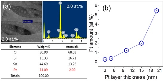 (a) Elemental analysis of 2.0 at.% Pt-functionalized SnO2 NFs using EDS; (b) Relationship between Pt amount and Pt layer thickness.