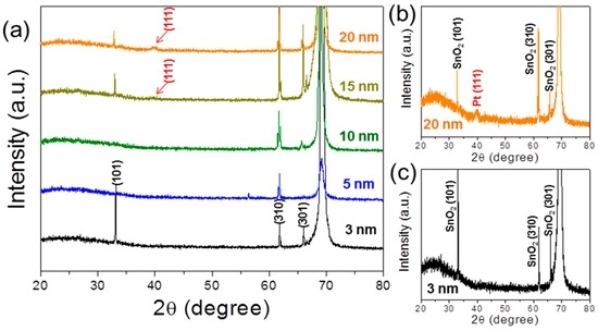 (a) XRD patterns for Pt-SnO2 NFs with various Pt layer thicknesses: (b) 20 nm-thick, and (c) 3 nm-thick Pt layers.