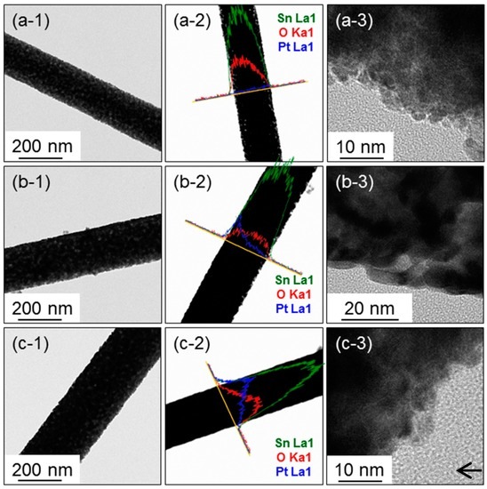 The microstructure of the SnO2 NFs functionalized with Pt NPs was further investigated by using TEM. As shown in Figure 4, individual NFs are quite uniform in diameter. The elemental line mappings, displayed in Figure 4(b-2,c-2), demonstrate the presence of a Pt element. In Figure 4(c-3), the arrow indicates the Pt NP.