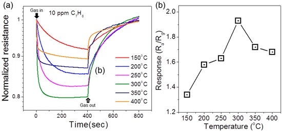 The optimal temperature was investigated by testing the sensing properties of pure SnO2 NFs at various temperatures (150 to 400 °C) using 10 ppm of C7H8. Figure 5a shows the resistance curves obtained at various temperatures. The response was summarized in Figure 5b, indicating the optimal temperature was found to be 300 °C. On the basis of the result, hereafter the sensing properties were investigated at that temperature. The resistance of SnO2 NFs decreases upon the introduction of C7H8 gas and recovers to its original value when the gas is removed, as shown in Figure 5a.