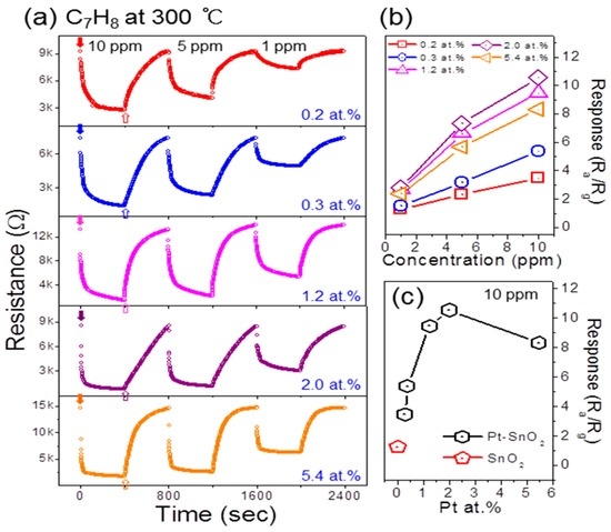 The sensing performances and the effect of the Pt amount were then evaluated at 300 °C using various concentrations of C7H8 gas. Figure 6a shows the typical resistance curves and responses of the SnO2 NFs with varying amounts of Pt NPs to low concentrations (1, 5, and 10 ppm) of C7H8 gas. The highest response was observed from the NFs with 2.0 at.% Pt, as shown in Figure 6b, where the responses are plotted as a function of gas concentration.