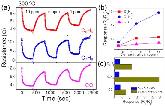In Figure 7c, the responses of 2.0 at.% Pt-functionalized SnO2 NFs are compared with pure SnO2 NFs for 10 ppm gases at 300 °C. This indicates the high catalytic effect of Pt NPs toward C7H8. Similar selective and enhanced catalysis behaviors of C7H8 by Pt NPs have been reported in our earlier studies [10,35], which show that the Pt NPs exhibit efficient catalytic activity for enhancing the diffusion and interaction with C7H8 gas compared to other reducing gases.