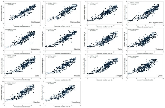 Comparison of the measured sunshine duration and estimated sunshine duration the different meteorological station over the Heihe River Basin in 2008.