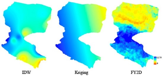 Figure 3 shows that the spatially distributed sunshine duration on the left map was obtained via IDW spatial interpolation (inverse distance weighting with exponent 2), and the middle map was obtained by the Kriging method (ordinary and exponential). At the same time, the different methods (ordinary or universal) were chose and different semivariogram models (e.g., spherical, circular, Gaussian, and linear) were used in the Kriging interpolation. The results from the Kriging interpolation was used as baseline data for comparison among the IDW method results and the proposed method results. Thus, the comparison results of the three methods show that it was large differences for the spatial distribution pattern.