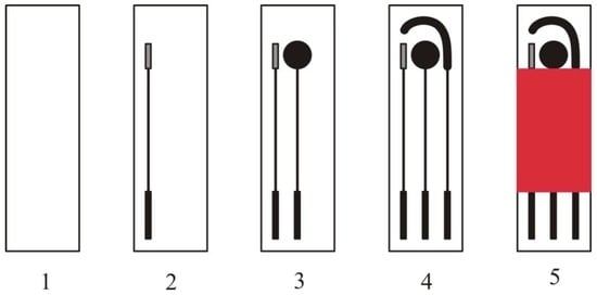 In genosensors, the target DNA is hybridized with a capture DNA probe fixed on electrode surface and with a signaling DNA probe. Electrochemical genosensors used in food safety assessment have been recently reviewed [] and the critical factors determining the analytical performances of genosensors have been discussed in several papers [,,]. The main points to consider in the design of genosensors are: optimal composition of the sensing layer including the density of capture probe, concentration and nature of diluent thiol, the geometry of the capture probe (hairpin or linear), the length of target DNA and the relative position of the recognition part of target DNA, hybridising with target and signalling probes. Lopez et al. [] focused on optimisation of the sensing phase using Design of Experiments, while Bezazzi et al. [] studied in more detail the configuration of capture DNA, target DNA and signalling probe with respect to length and position of the signalling probe on the hybridized construct. Optimum results were found when the signalling probe and capture probe were contiguous along the target DNA when hybridised (Figure 2). The main construction steps and the principle of individual genosensors included in the array are illustrated in Figure 2.