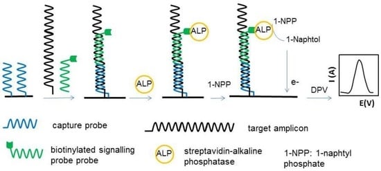 Hazelnuts (Corylus avellana) account for an important segment of the world’s trade of tree nuts after almonds, pistachios, walnuts and cashews, with the global production amounting to 337, 870 metric tons and a supply value of $3717 million in 2014 []. While used for many applications in the food industry, hazelnuts have also a high allergenic potential for sensitized people, which react to either the nut itself, the pollen of the hazelnut tree or to both. A comprehensive discussion on hazelnut allergens and biosensing strategies developed so far for their detection was recently published []. As summarized, there are 10 groups of allergenic “corylin” proteins characterised so far in hazelnuts, namely: Cor a 1, Cor a 2, Cor a 8, Cor a 9, Cor a 10, Cor a 11, Cor a 12, Cor a 13, Cor a 14 and Cor a TLP. Some of these groups include various isoallergens and each isoallergen might present different isoforms. Various ELISA tests have been described in literature for hazelnuts detection in cookies, biscuits, chocolates, breakfast cereals and cereal bars, ice-cream, olive oil, etc., with LOD of 0.1–3 mg/kg, as summarized by Alves et al. []. To these add mass-spectrometry-based methods and methods based on detection of DNA encoding the allergen proteins (real-time PCR, etc.). A few biosensors have also been developed, mostly optical ones. There is only one example of electrochemical screen-printed biosensors so far, namely a DNA array for PCR amplified detection of hazelnut allergens in foodstuffs []. The DNA array consists of eight screen-printed Au electrodes modified with thiolated DNA capture probes and blocked with 6-mercapto-1-hexanol. The target analytes were fragments of the genes related to the expression of Cor a 1 isoallergen proteins Cor a 1.03 and Cor a 1.04. The DNA was extracted from food samples with a commercial extraction kit and was amplified by PCR. The capture probes were DNA sequences, complementary to the target DNA. A sandwich configuration was used where the target DNA fragments were hybridized with capture probes at the surface of the sensor and with signaling probes, labeled with alkaline phosphatase (ALP). The detection of target DNA was enabled via enzymatic transformation of ALP substrate 1-naphtyl phosphate and electrochemical detection of the enzymatic product, 1-naphtol by DPV (Figure 2). Although the construction of such genosensors requires optimisation of several steps, a very important advantage is that this “generic” sensor design could be used for simultaneous detection of multiple target analytes (e.g., multiple allergens), simply by adequately changing the capture and signalling probes.