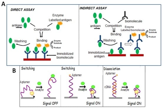 (A) Direct and Indirect competitive formats in the affinity based biosensors; (B) Additional formats in case of aptamer based assays.